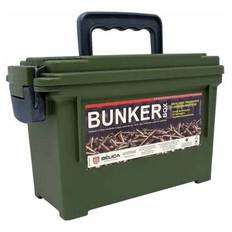 A Caixa Bunker Box Bélica oferece o conceito das famosas caixas militares para armazenamento e transporte de munições, kits de limpeza e pequenos equipamentos indispensáveis para sua missão. Construída em polímero, possui vedação O-Ring, trava de aço 1070, alça reforçada e guia de cadeado, mantendo seu equipamento mais seguro.