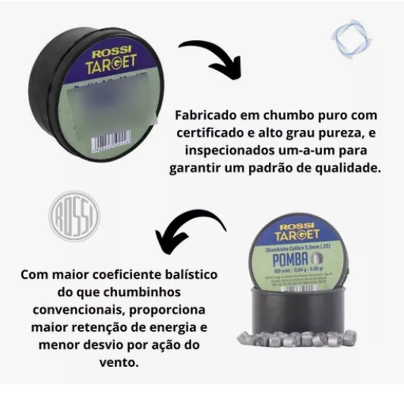 O Target Pomba da Rossi traz uma padronização nos pesos dos chumbinhos onde cada chumbinho desse modelo pesa 0,64 g / 9,95 grains.