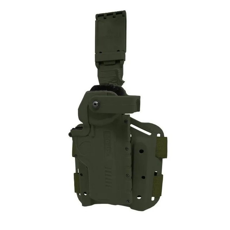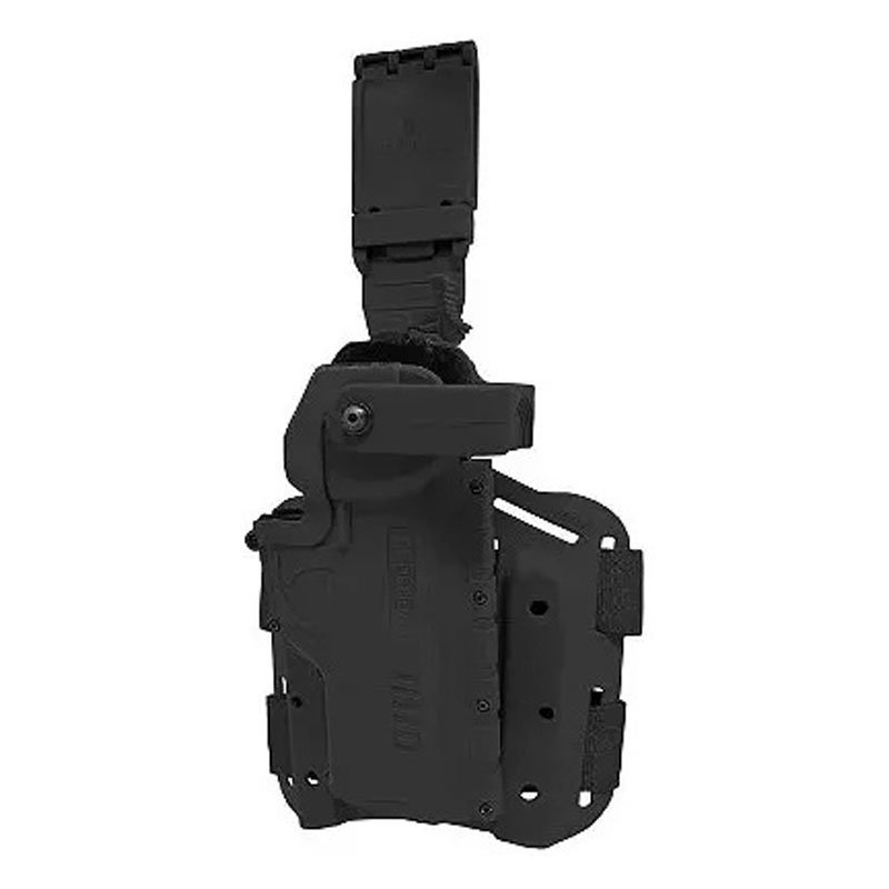 O Coldre Hammer foi desenvolvido para uso em quaisquer condições ações tática, civis ou militares. Forte, robusto e funcional, traz consigo comodidade e eficiência no sistema de retenção da arma. Dispõe da combinação de duas travas que aliam saque rápido e segurança operacional. Especificações: – Fabricado em polímero de alta resistência; – Sistema de travamento Dual Lock System, evitando que aconteça o destravamento indevido do Coldre; – Trava de segurança (tipo alça) anti-arrebatamento Thumb-Break; – Revestimento interno em couro legítimo, proporciona maior proteção, diminui o atrito entre arma e equipamento, evitando o desgaste de ambos; – Possui sistema de catraca rotativa, permitindo a angulação do Coldre em sua base, facilitando o manuseio da arma; – A catraca permite fixação do Coldre em outra base compatível. Plataforma (nova fita): – Sistema de plataforma Belt-Lock Spin, (conjunto formado com a alça fixação ao cinto com sistema rotativo), dispõe de trava para liberação do cinto de guarnição 7 níveis diferentes de regulagem; – Plataforma é totalmente confortável, flexível e resistente; – Projetada para seguir a anatomia da perna; – Possui Fitas emborrachadas, altamente aderentes, evitando que a plataforma altere sua posição; – Conta com fivelas com trava tripla, para maior segurança. Itens inclusos: – 01 coldre – 01 protetor de coxa – 02 chaves para ajustes Compatível com: Beretta M9, M9 A3, PX4 STORM, 92 FS, 92 A1, Grand Power P380, PT 24/7, TX 22, PT 58 HC PLUS, PT 59 ACP, PT 92, PT 92 AF, PT 100 AF, PT 100, PT 640, PT 809 C, PT 809, PT 838, PT 845, PT 917, PT 940. PT59 M9A3, PX4 STORM, 92 FS, 92A1, Grand Power P380, PT24/7, TX22, PT58 HC PLUS, PT59 ACP, PT92, PT92 AF, PT100 AF, PT100, PT640, PT809 C, PT809, PT838, , PT845, PT917, PT940, *Caso tenha dúvidas, verifique a compatibilidade de outras armas com nossa equipe antes de efetuar a compra. Medidas aproximadas: – Comprimento: 34 cm – Largura: 18 cm – Espessura: 9,5 cm – Peso: 0,620g