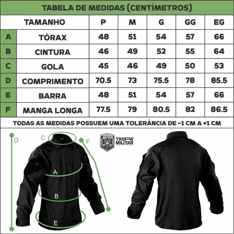 A Camisa Tática Combat Shirt possui características para uso tático. Foi desenvolvida pensando no conforto do usuário. Tem um design bem rente ao corpo, que facilita a transpiração na região do tórax, abdômen e abaixo dos braços. Nas mangas e golas o tecido é o rip-stop. Extremamente resistente a rasgos e trações, possui acabamento soft-finishing proporcionando toque suave e conforto inigualável ao usuário. CARACTERÍSTICAS: – Bolsos táticos – Gola com fechamento em Zíper – Reguladores de punho Cuidados: Lavar do avesso Lavar cores similares Lavar à temperatura max. 40ºC Não alvejar Não secar a baixa temperatura Passar a temp. max 110ºC Não lavar a seco Garantia do vendedor: 30 dias
