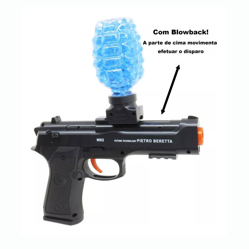 Este é um brinquedo que é conduzido por uma mola e usa uma bola de gel como munição com composição de 90% de água