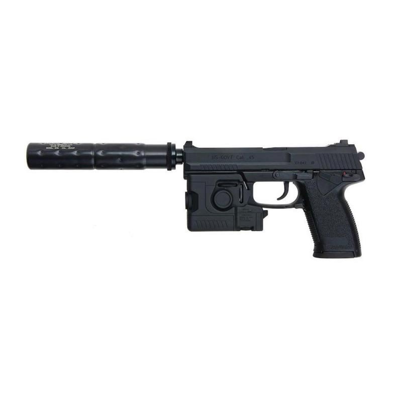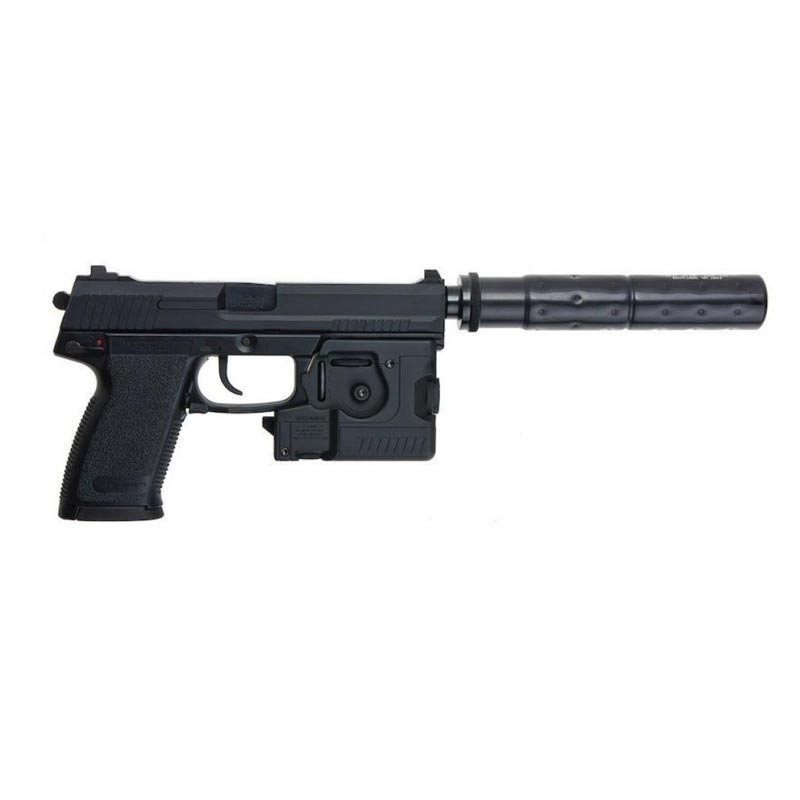 A popular pistola de forças especiais MK23 é rebatida pela TOKYO MARUI nesta versão de corrediça fixa com unidade LAM completa e silenciador SOCOM destacável em metal incluído. Vem em estojo de transporte de plástico arrumado. A ação de deslizamento fixa significa que não há ciclagem do slide e o hammer se inclina e solta enquanto você puxa o gatilho para cada tiro.