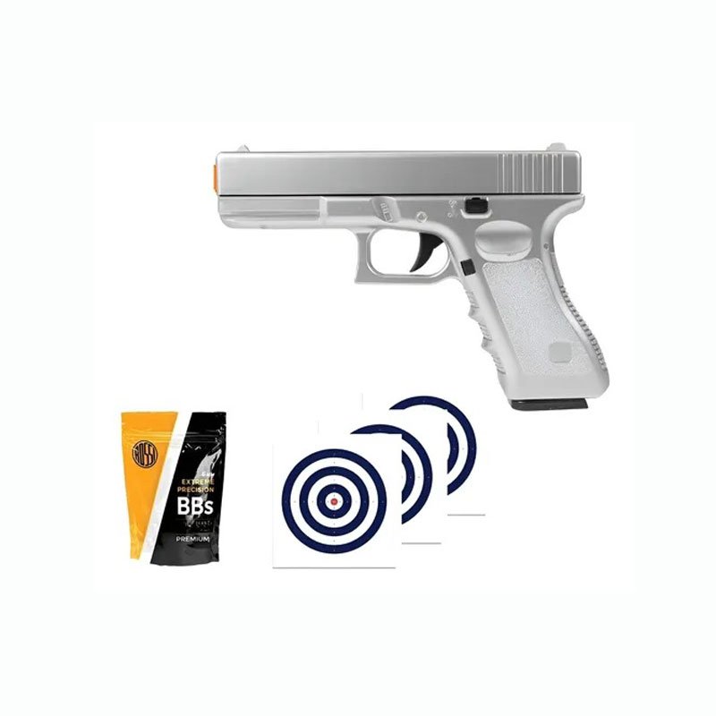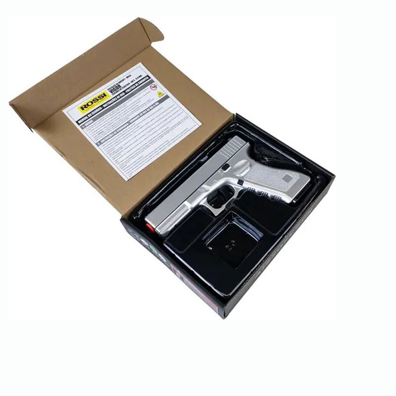 A Pistola Airsoft de Mola VG GK-V20 Silver Metal 6mm é uma escolha excepcional para quem busca um equipamento confiável e de alta qualidade para recreação. Com um calibre de 6,0 mm e ação de mola, essa pistola oferece modo de disparo por repetição manual, utilizando esferas de plástico como munição. Com uma velocidade máxima de 45 m/s (147 fps) e energia de 0,2 joules, a VG GK-V20 é capaz de proporcionar uma experiência de tiro satisfatória e consistente, com engatilhamento manual por ferrolho e capacidade de munição para 11 esferas. Seu peso de 480 g e comprimento de 200 mm garantem um manuseio confortável.